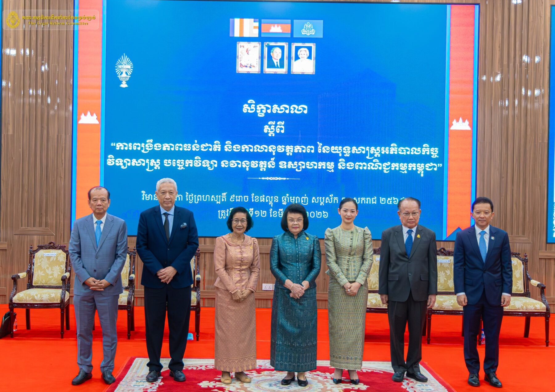 នាព្រឹកថ្ងៃព្រហស្បតិ៍ ៩រោច ខែផល្គុន ឆ្នាំម្សាញ់ សប្តស័ក ពុទ្ធសករាជ ២៥៦៩ ត្រូវនឹងថ្ងៃទី១២ ខែមីនា ឆ្នាំ២០២៦ នៅវិមានរដ្ឋសភា ឯកឧត្តម លី ច័ន្ទតុលា រដ្ឋលេខាធិការទីស្តីការគណៈរដ្ឋមន្ត្រី អនុប្រធាន និងជាអគ្គលេខាធិការ គណៈកម្មាធិការដឹកនាំការកែទម្រង់ច្បាប់ (គ.ក.ច.) បានចាត់លោក មាឃ សីហា, លោក ច័ន្ទតារា រ៉ូម៉ែន និងលោក ណេង សីហា ជាជំនាញការច្បាប់ នៃ គ.ក.ច. ចូលរួមសិក្ខាសាលាស្តីពី ការពង្រឹងភាពធន់ជាតិ និងកាលានុវត្តភាពនៃយុទ្ធសាស្ត្រអភិបាលកិច្ច វិទ្យាសាស្ត្រ បច្ចេកវិទ្យា នវានុវត្តន៍ ឧស្សាហកម្ម និងពាណិជ្ជកម្មកម្ពុជា ក្រោមអធិបតីភាពដ៏ខ្ពង់ខ្ពស់ សម្តេចមហារដ្ឋសភាធិការធិបតី ឃួន សុដារី ប្រធានរដ្ឋសភា ដោយមានការចូលរួមជាគណៈអធិបតី រួមមាន លោកជំទាវ និន សាវុន ប្រធានគណៈកម្មការសាធារណការ ដឹកជញ្ជូន អាកាសចរណ៍ស៊ីវិល ប្រៃសណីយ៍ ទូរគមនាគមន៍ ឧស្សាហកម្ម វិទ្យាសាស្ត្រ បច្ចេកវិទ្យា នវានុវត្តន៍ រ៉ែ ថាមពល ពាណិជ្ជកម្ម រៀបចំដែនដី នគរូបនីយកម្ម និងសំណង់ (គណៈកម្មការទី៩) នៃរដ្ឋសភា ឯកឧត្តម អ៊ុ សារឹទ្ធ ប្រធានគណៈកម្មការសាធារណការ ដឹកជញ្ជូន អាកាសចរណ៍ស៊ីវិល ប្រៃសណីយ៍ ទូរគមនាគមន៍ ឧស្សាហកម្ម វិទ្យាសាស្ត្រ បច្ចេកវិទ្យា នវានុវត្តន៍ រ៉ែ ថាមពល ពាណិជ្ជកម្ម រៀបចំដែនដី នគរូបនីយកម្ម និងសំណង់ (គណៈកម្មការទី៩) នៃព្រឹទ្ធសភា ឯកឧត្តមសាស្ត្រាចារ្យបណ្ឌិត ឆែម គាតរិទ្ធី ទេសរដ្ឋមន្ត្រីទទួលបន្ទុកបេសកកម្ម ពិសេស និងជាប្រធានក្រុមប្រឹក្សាសេដ្ឋកិច្ច សង្គមកិច្ច និងវប្បធម៌ ឯកឧត្តម ជា វ៉ាន់ដេត រដ្ឋមន្ត្រីក្រសួងប្រៃសណីយ៍ និងទូរគមនាគមន៍ ឯកឧត្តម ហែម វណ្ណឌី រដ្ឋមន្ត្រីក្រសួងឧស្សាហកម្ម វិទ្យាសាស្ត្រ បច្ចេកវិទ្យា និងលោកជំទាវ ចម និម្មល រដ្ឋមន្ត្រីក្រសួងពាណិជ្ជកម្ម